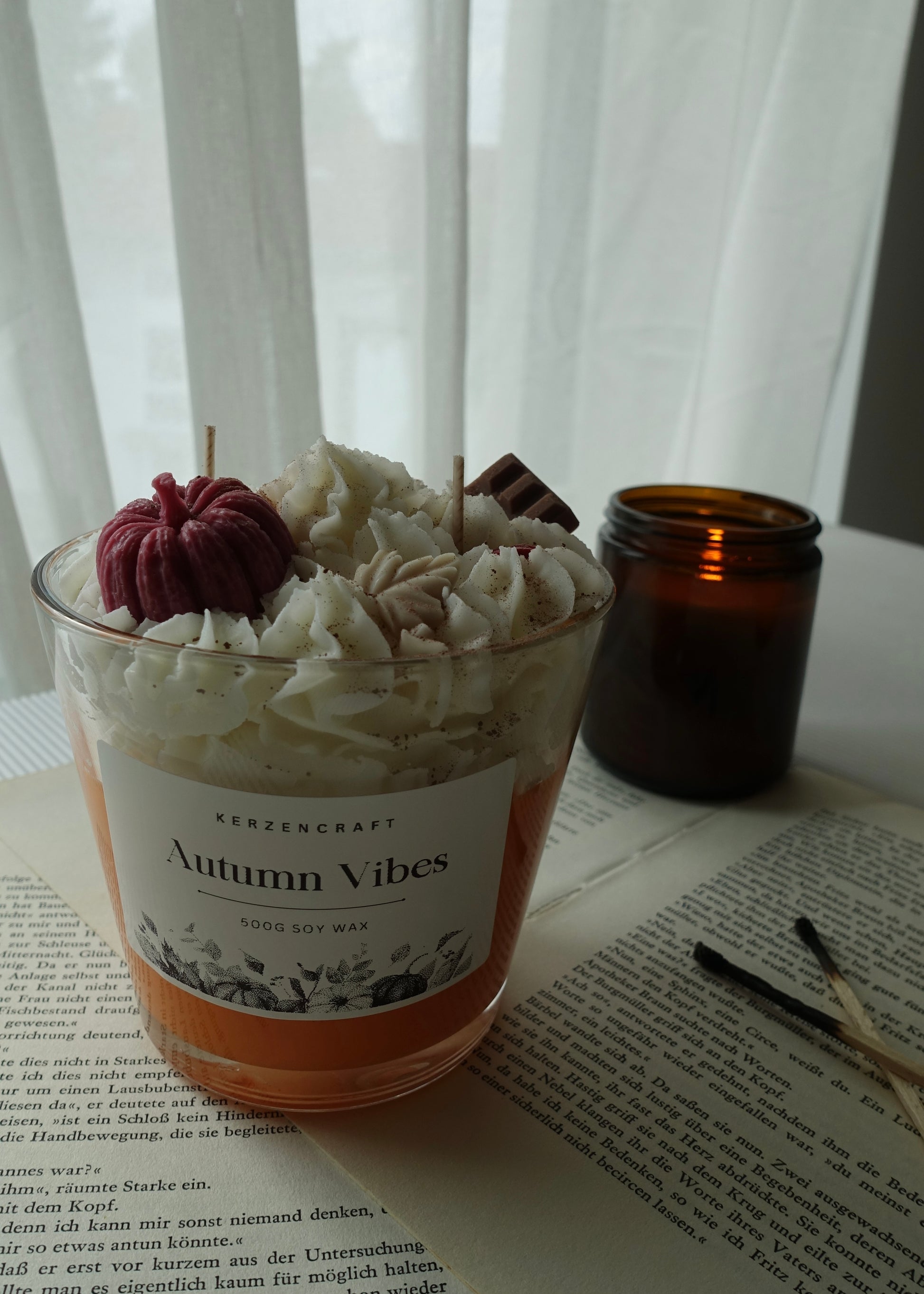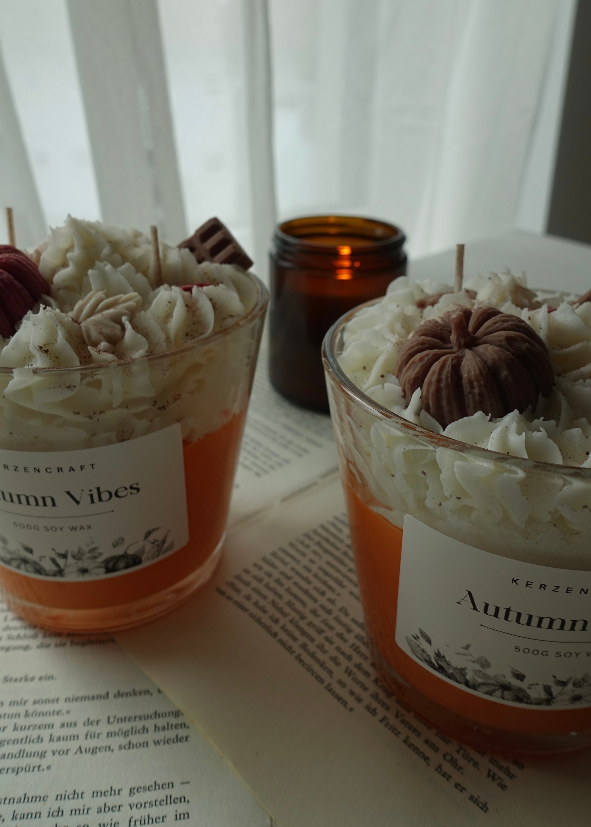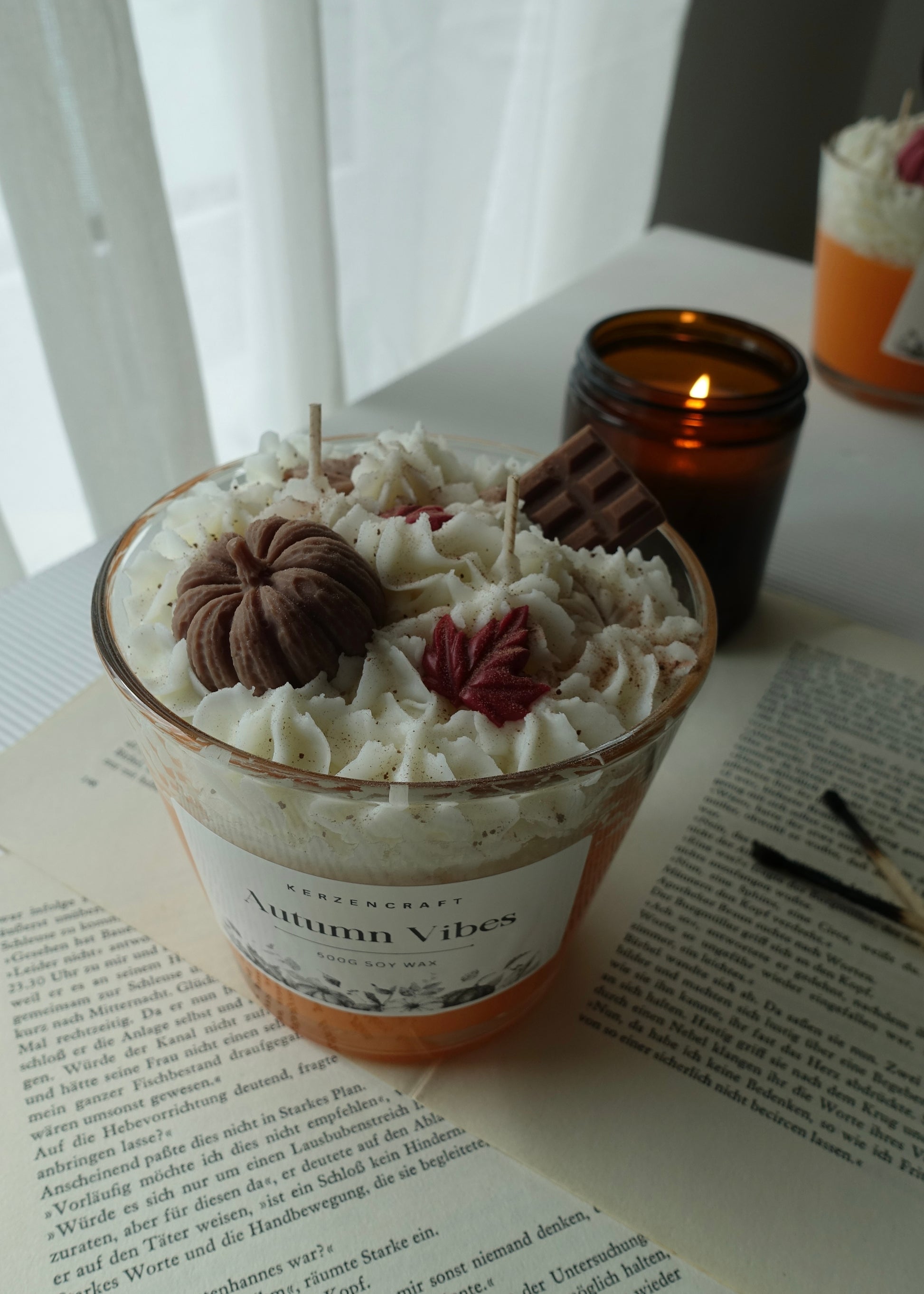Tauche ein in den Zauber des Herbstes: Autumn Vibes vereint cremige Whip-Details, liebevoll gefertigte Deko-Elemente wie Kürbis, Schokolade und Herbstblätter und bringt das Gefühl von warmen Abenden und gemütlichen Stunden direkt in dein Zuhause.