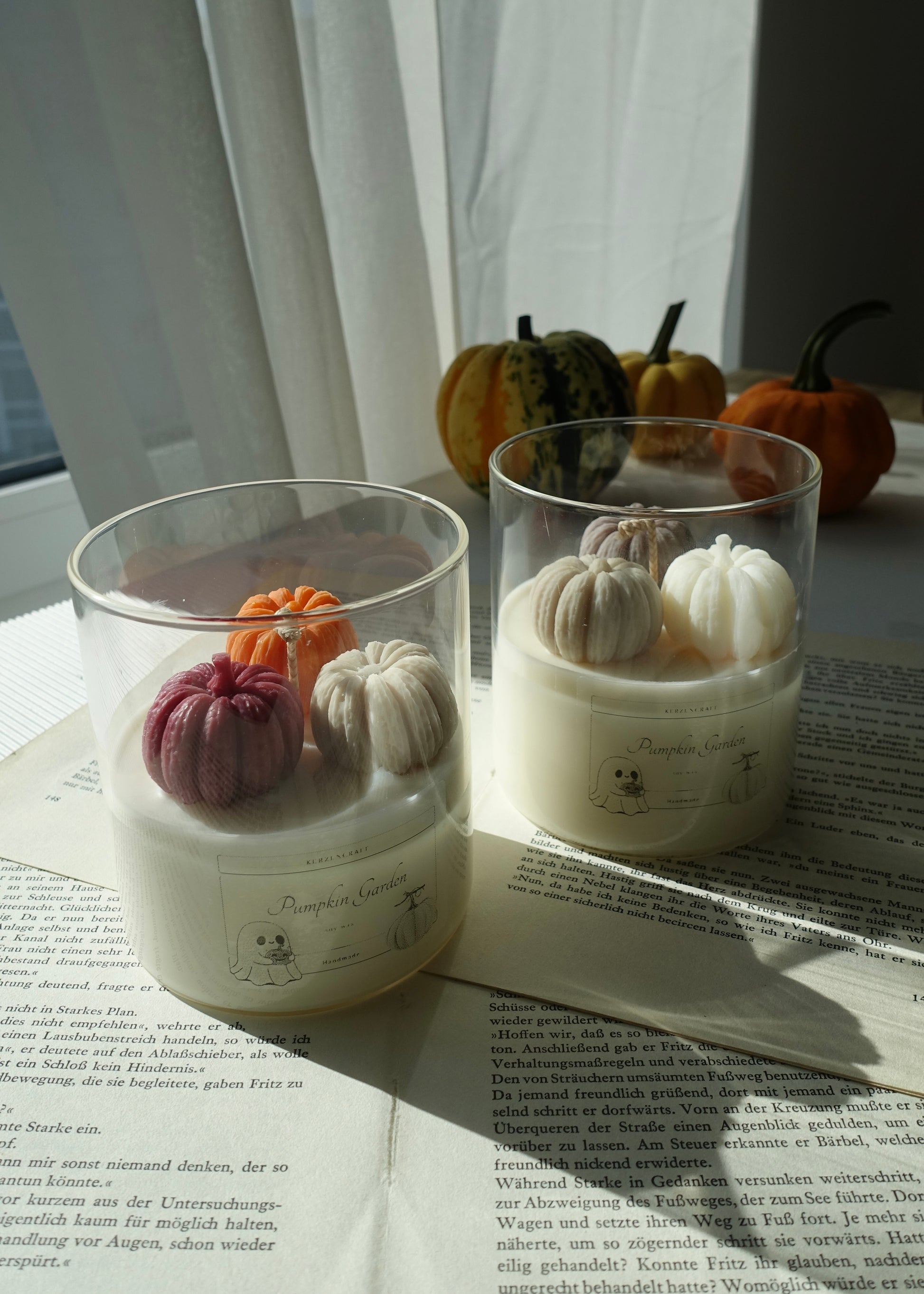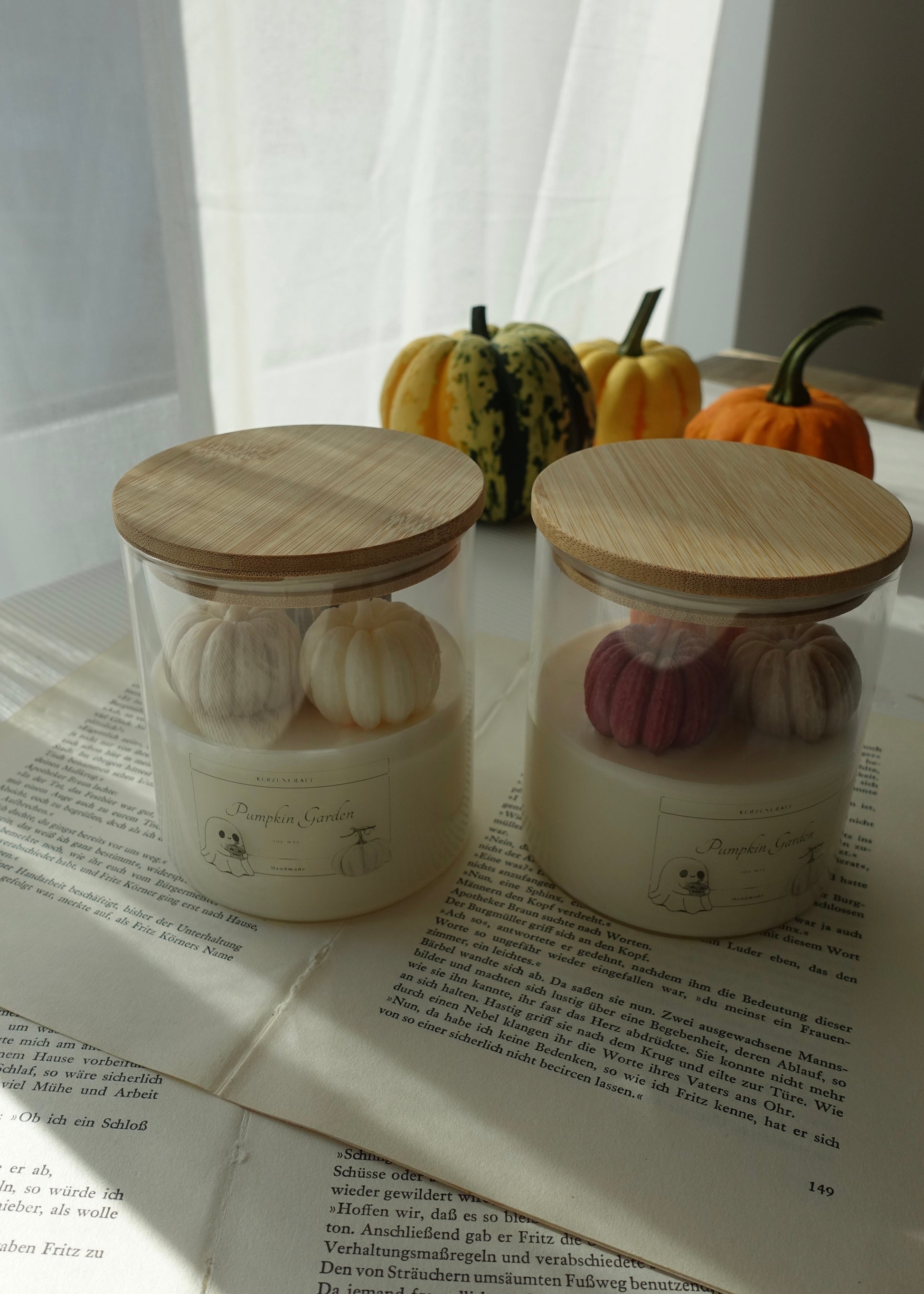 Tauche ein in den Zauber des Herbstes: Pumpkin Garden vereint zarte Kürbis-Details aus Wachs, einen natürlichen Look im Glas mit Holzdeckel und bringt das Gefühl von goldenen Herbsttagen und gemütlichen Stunden direkt in dein Zuhause.